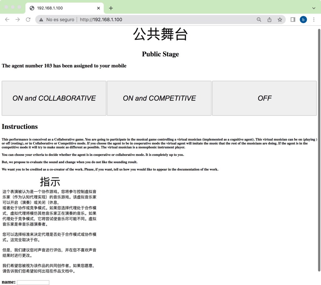 “Public stage” is an algorithmic and interactive work, collectively created in real-time during the performance[1]. The score is created through multiple cognitive agents controlled by the attendees. The singers receive the real-time notes composed by this system on his/her mobile phone. Each attendee controls a cognitive agent via a mobile device. “Public stage ” is collectively created in real-time during the performance [2].
