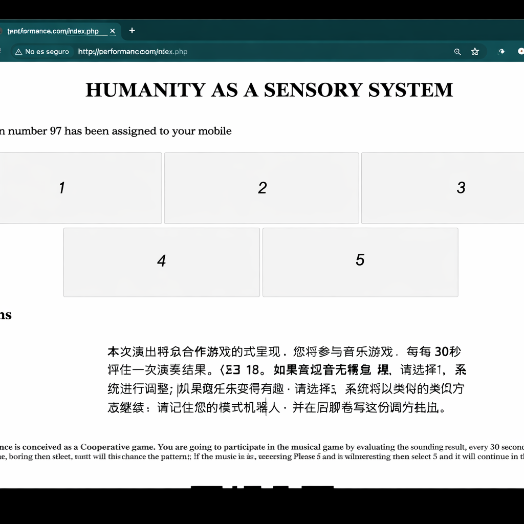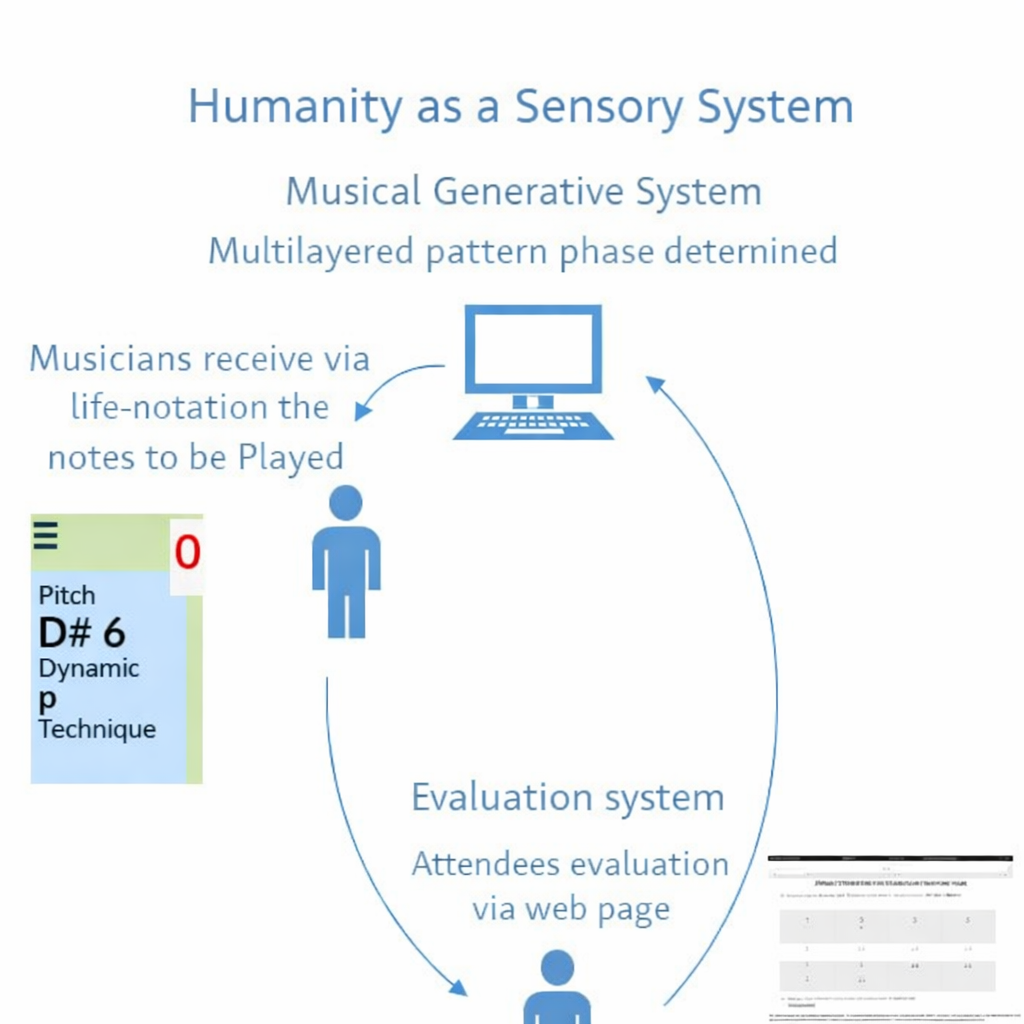 Humanity as a Sensory System is a work for Two Voices and ensemble, live notation, live generative system, live electronics, and attendees’ participation. Humanity as a Sensory System is a Collaborative and interactive work in which the work is real-time created by the evaluation of the work. Attendees will evaluate the work through a web app, and the musical generative system will change in real-time according to the evaluations. The Musicians will receive the notes via a live notation system on their mobile phones. This work belongs to a series of works in which the composer creates a self-referential musical generative system based on the real-time evaluation of the work. The main musical material of this work is its evaluation. The work duration is about 8 minutes. The title of the work refers to the embodiment that the participation in this event creates between the attendees when they collaborate to create something.