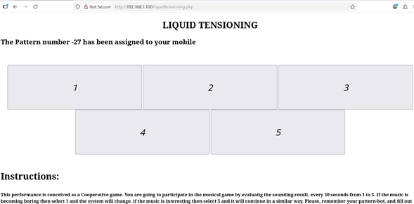 This Work is a circular self-referential musical cooperative game. The attendees connect to a Wi-Fi network and then to a web server. They will interact with the system through a web page, evaluating the sounding result every 30 seconds. Then the generative system will react to the evaluations. If the evaluations are positive, the system will not change. If the evaluations are negative, the system will change, and the sounding result will change.