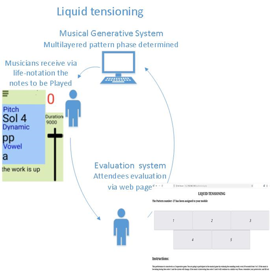 Liquid Tensioning is a work for violin and bass clarinet, live notation, live generative system, live electronics, and attendees’ participation. Liquid tensioning is a Collaborative and interactive work. The work is real-time, created by the evaluations of the attendees. The attendees will evaluate the evolution of the material via a web app, and the musical generative system will change according to the evaluation in real time. The Musicians will receive the notes via a live notation system on their mobile phones. The title of the works refers to the model of tensioning provided by the generative system. This model is based on a musical tensioning that is not related to the properties of the musical material. This work belongs to a series of works in which the composer creates a self-referential musical generative system based on the real-time evaluation of the work. The main musical material of this work is its evaluation.