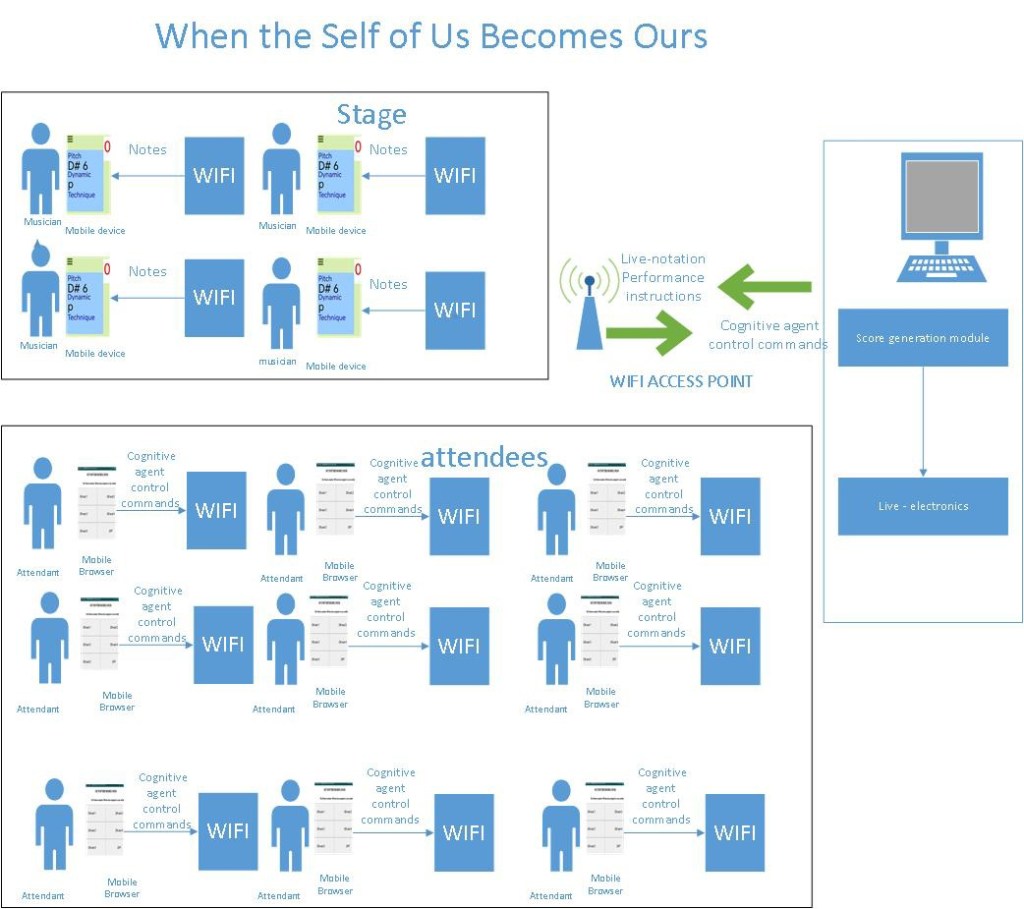 When The Self of Us Becomes Ours is a work for four String instruments, live notation, live generative system, live electronics, and attendees’ participation. When The Self of We Becomes Ours is a Collaborative and interactive work in which the work is real-time created by the self-evaluation of the work. Attendees will evaluate the work through a web app, and the musical generative system will adjust in real-time according to their evaluations. The Musicians will receive notes via a live notation system on their mobile phones. The title of the works refers to the circular loop created between the attendees, the musical generative system, and their interconnection. This work belongs to a series of works in which the composer creates a self-referential musical generative system based on the real-time evaluation of the work. The main musical material of this work is its evaluation. The work duration is about 10 minutes. The title of the work refers to the embodiment that the participation in this event creates between the attendees when they collaborate to create something.