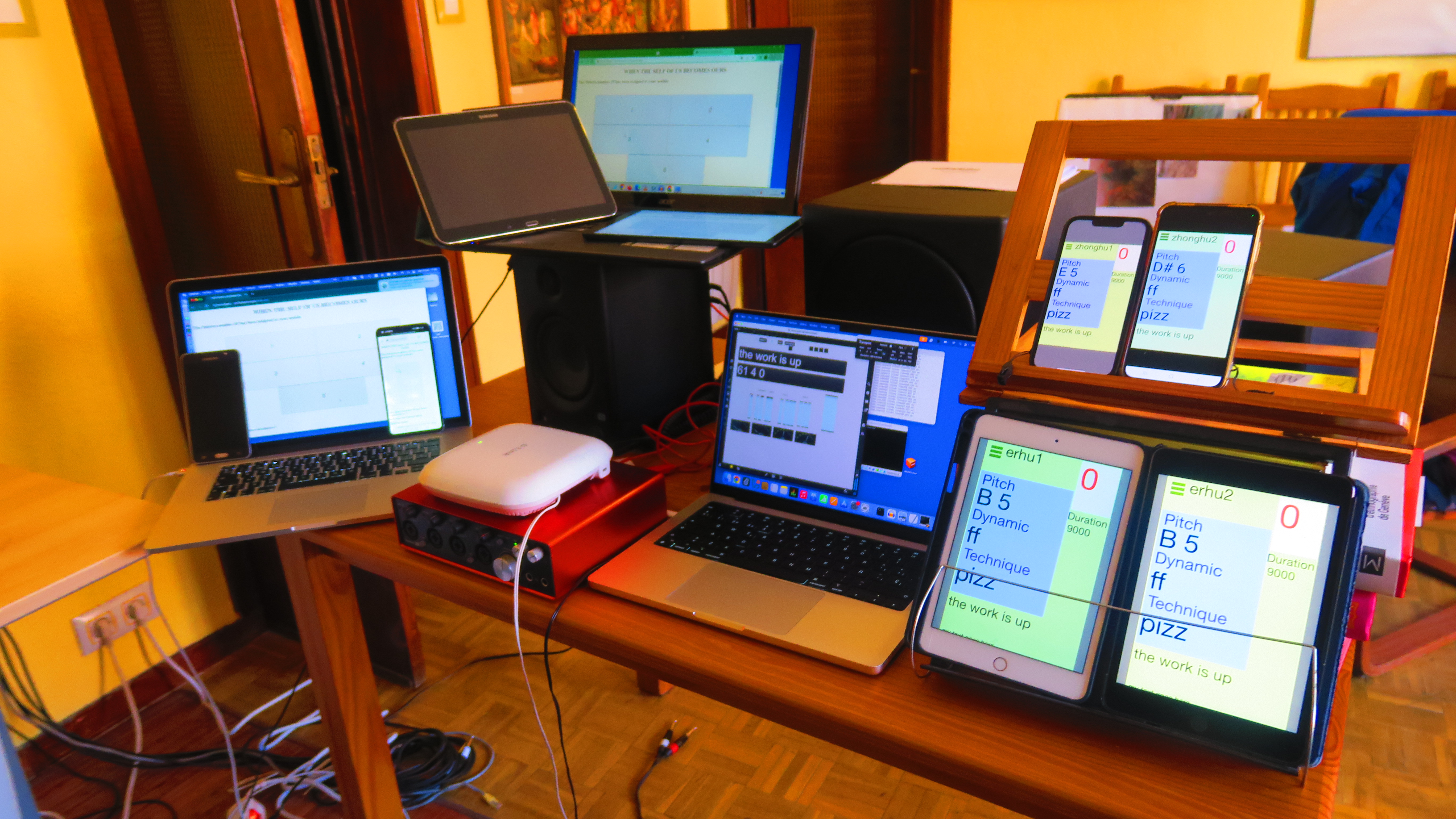 iPad connected to the web server, Android mobile devices receive notes via live notation, the laptop with the Max patch, and the virtual machine with the Ubuntu Web Server.
